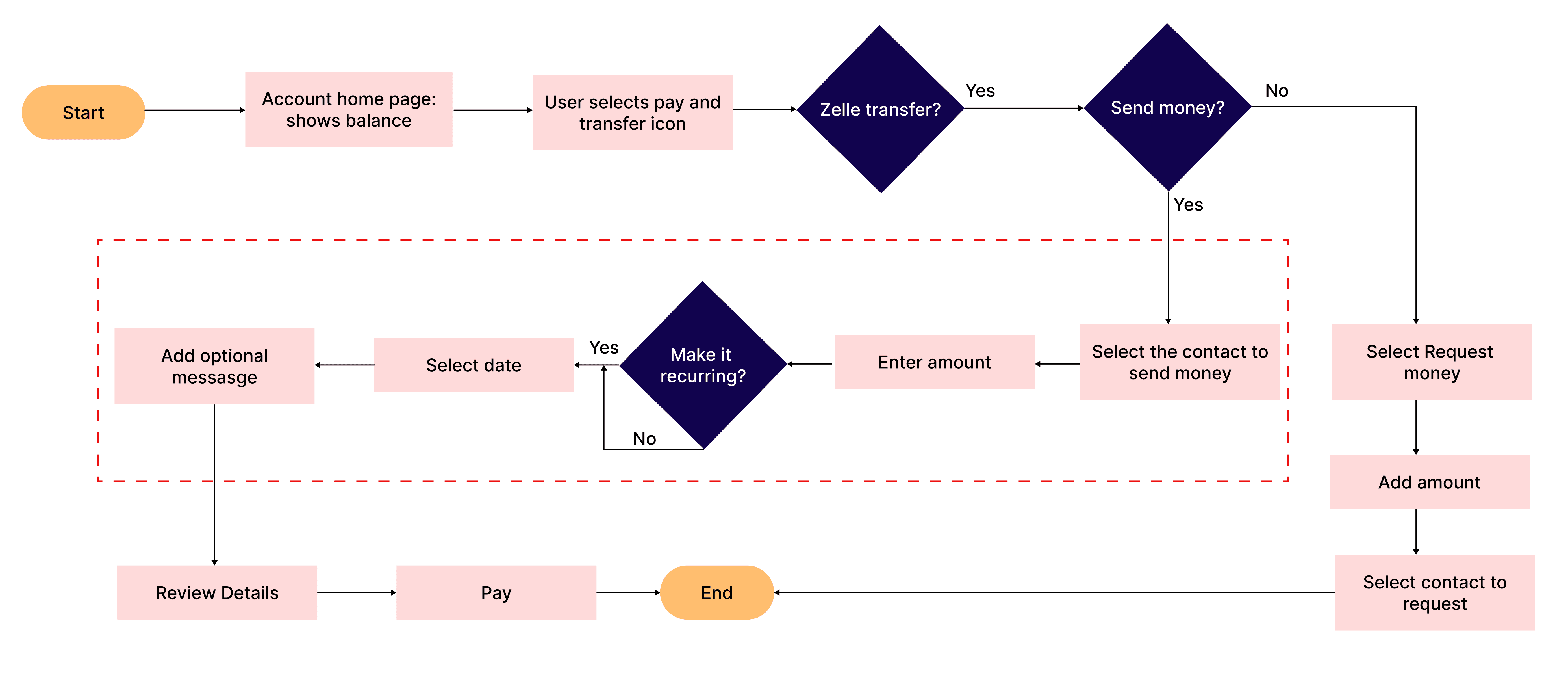 This diagram shows the full journey—from opening the Bank of America app to completing a successful Zelle payment. The dashed sections highlight where users face the most friction: multiple screens, redundant steps, and moments that cause them to pause and question what’s different. These friction points define the core scope of this redesign project.